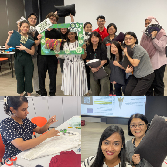 We partnered with PSA International to engage their employees through a hands-on workshop. In this interactive session, participants transformed pre-loved polo T-shirts into customised stuffed pillows—combining practical sewing techniques with sustainable design thinking.